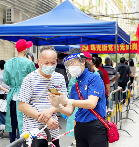 廣東德信行大藥房員工積極響應各地政府街道號召,主動挑起央企擔當,作為志愿者到疫情一線支援核酸檢測?!跋壬梢詫⑦@個粵核酸碼截圖,下次直接展示截圖就能核酸采樣了?!倍啻沃г狞h員代表梁琪,駕輕就熟地指導著居民采樣,她親切耐心地答疑解惑,街坊們紛紛為她點贊。