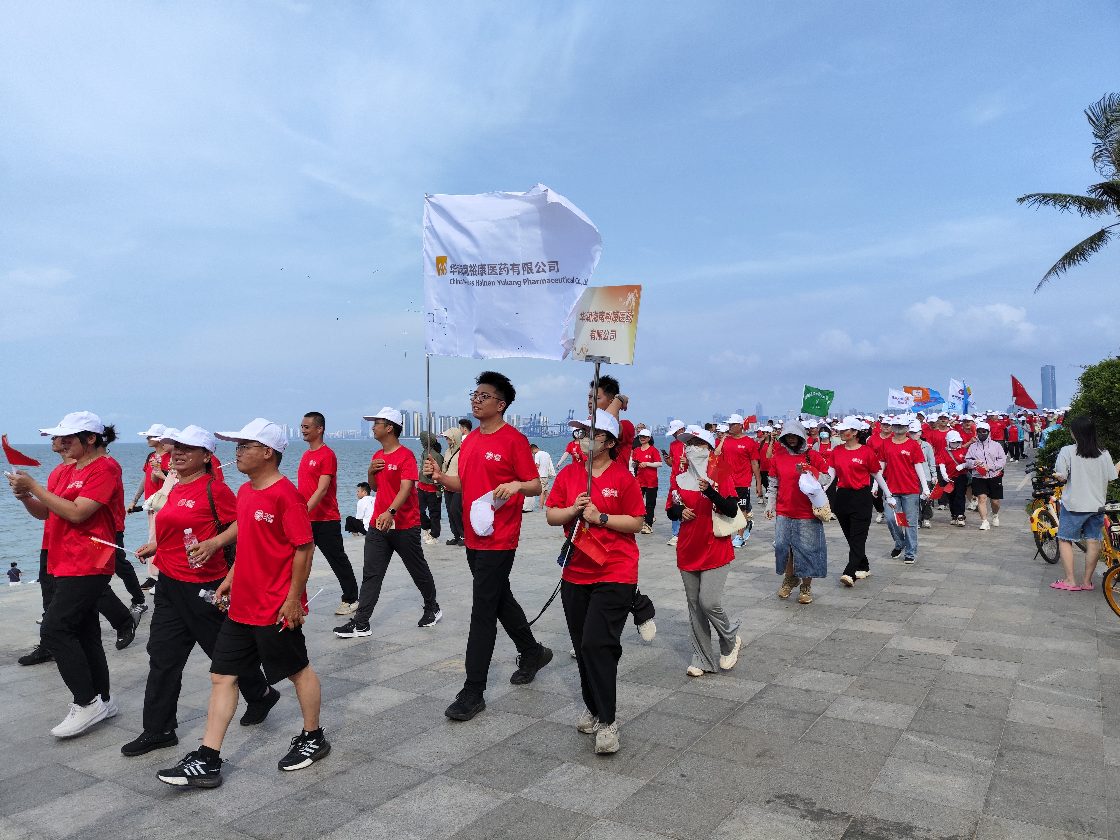 本次活動(dòng)是海南省醫(yī)藥行業(yè)協(xié)會(huì)為慶祝中華人民共和國(guó)成立76周年、傳播“快樂(lè)工作,健康生活”理念、凝聚行業(yè)合力而舉辦。活動(dòng)地點(diǎn)設(shè)在風(fēng)景怡人的??谟^(guān)海臺(tái),共40余家會(huì)員單位800余人參加,華潤(rùn)海南裕康醫(yī)藥作為副會(huì)長(zhǎng)單位,組織近40名職工代表參加活動(dòng)。“我們是——華潤(rùn)海南??滇t(yī)藥;我們的方針是——質(zhì)量第一,用戶(hù)至上;我們的使命是——潤(rùn)澤健康,共創(chuàng)美好”。在熱身活動(dòng)環(huán)節(jié),華潤(rùn)海南??滇t(yī)藥的隊(duì)伍以洪亮的口號(hào)展示昂揚(yáng)的士氣,在迎風(fēng)招展的旗幟下,一聲高過(guò)一聲的“有華潤(rùn),多美好”震蕩在每個(gè)人耳畔。在協(xié)會(huì)會(huì)長(zhǎng)劉文民熱情洋溢的開(kāi)幕布致辭后,健步活動(dòng)吹響了出發(fā)的號(hào)角,浩浩蕩蕩的徒步隊(duì)伍延伸在椰林沙灘上。華潤(rùn)海南??滇t(yī)藥隊(duì)伍歷時(shí)一個(gè)小時(shí)完成了6公里的行程,無(wú)一人掉隊(duì)。