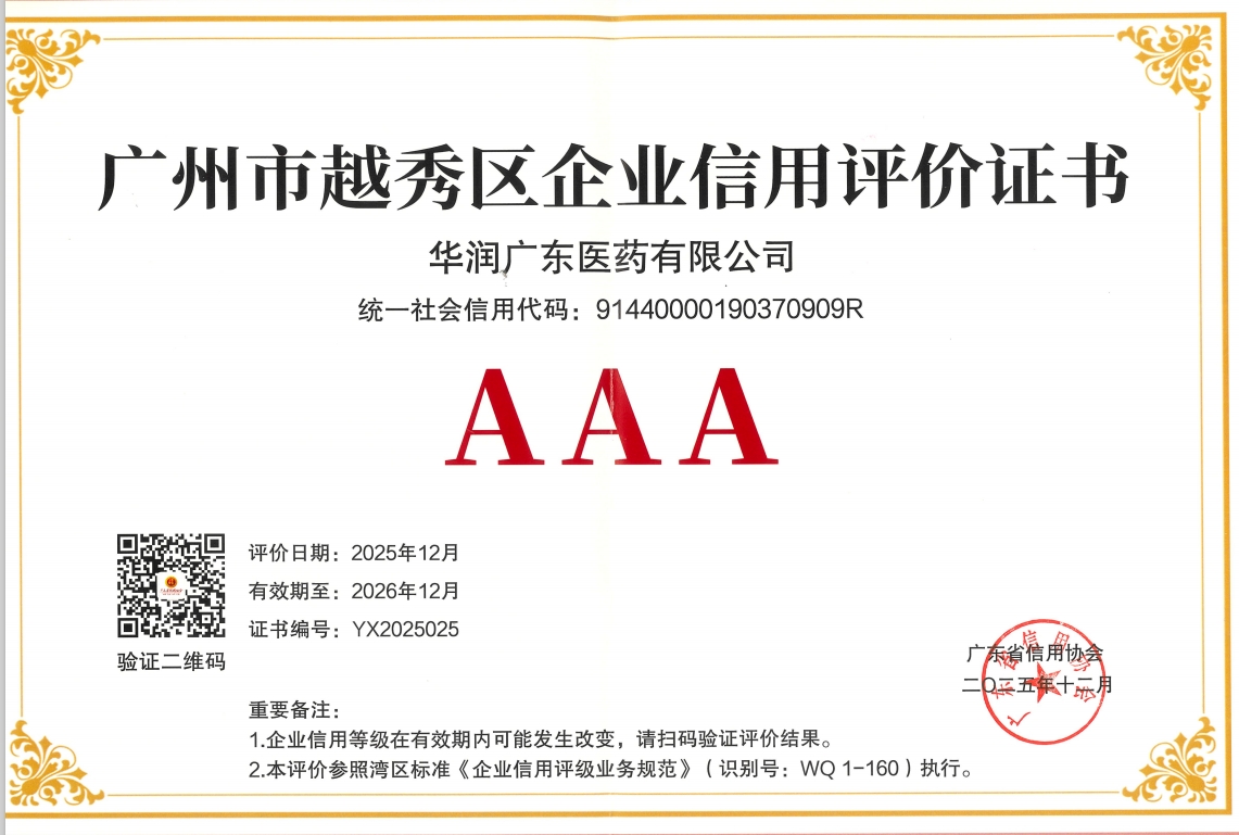 12月8日,華潤(rùn)廣東醫(yī)藥有限公司受邀參加廣州市越秀區(qū)社會(huì)信用體系建設(shè)主題活動(dòng),活動(dòng)上公布了2025年度越秀區(qū)企業(yè)信用評(píng)價(jià)結(jié)果,華潤(rùn)廣東醫(yī)藥獲評(píng)廣州市越秀區(qū)2025年度企業(yè)信用評(píng)價(jià)最高信用等級(jí)“AAA”級(jí)認(rèn)證,這也是公司連續(xù)第五年獲評(píng)越秀區(qū)誠(chéng)信企業(yè)評(píng)價(jià)。
