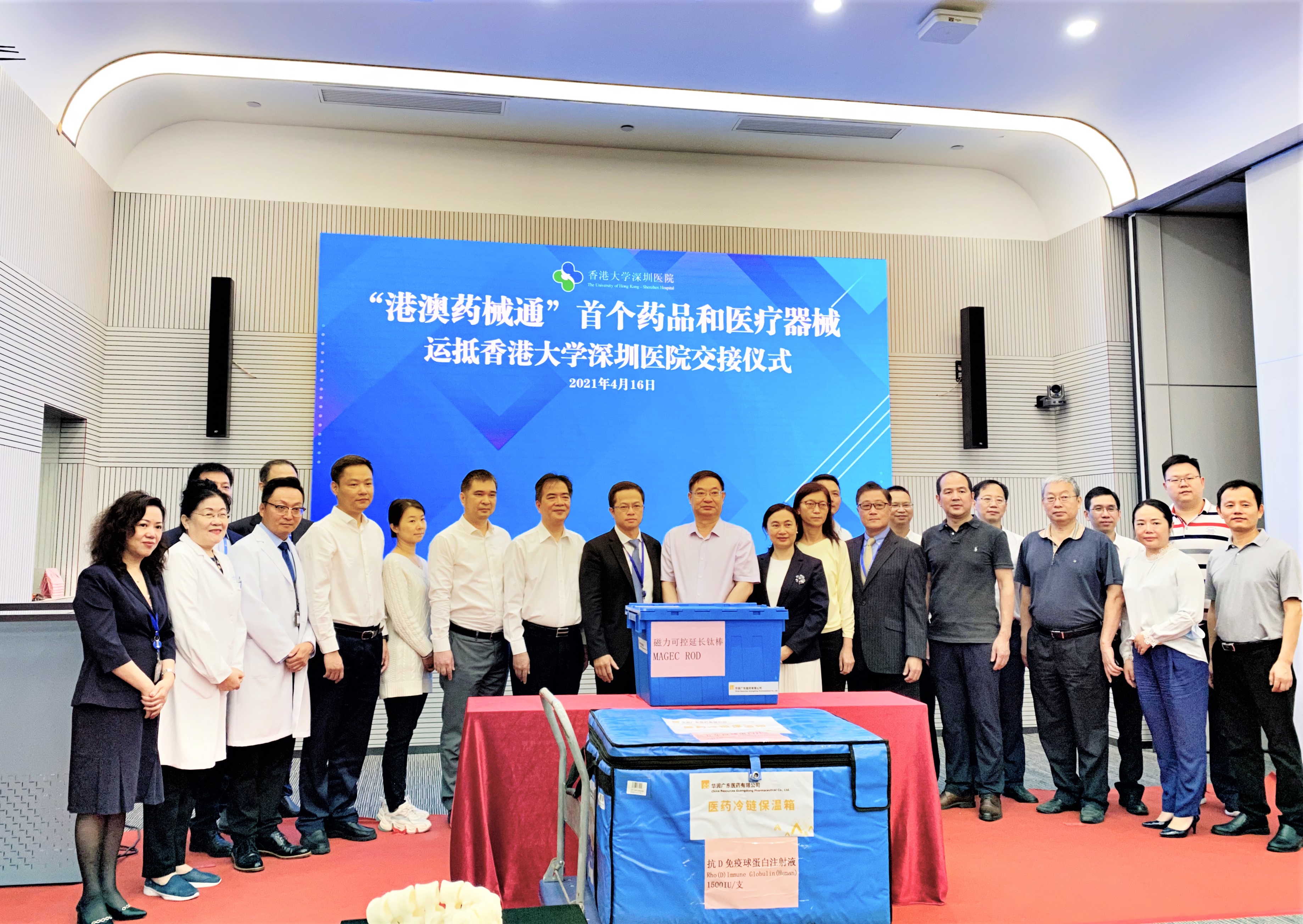 2021年4月16日上午九點(diǎn),香港大學(xué)深圳醫(yī)院(以下簡(jiǎn)稱:港大深圳醫(yī)院)和華潤(rùn)廣東醫(yī)藥有限公司(以下簡(jiǎn)稱:華潤(rùn)廣東醫(yī)藥)正式交接“港澳藥械通”首個(gè)藥品(抗D免疫球蛋白注射液)和醫(yī)療器械(磁力可控延長(zhǎng)鈦棒)。