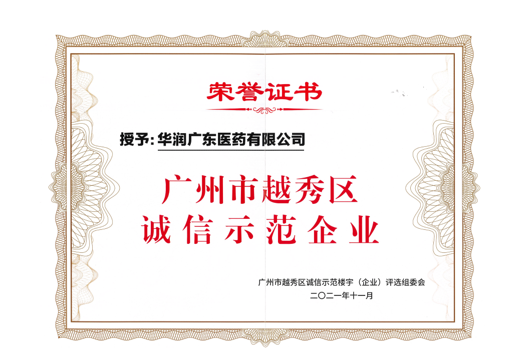 2021年11月25日,廣州市越秀區(qū)2021年度“誠信示范企業(yè)”及“誠信示范樓宇”授牌儀式在珠江國際大廈隆重舉行。廣州市信用辦、越秀區(qū)信用辦、越秀區(qū)商務(wù)局、越秀區(qū)市場監(jiān)督局、廣東省信用協(xié)會等單位領(lǐng)導(dǎo)分別為獲批企業(yè)和樓宇頒發(fā)牌匾和證書。華潤廣東醫(yī)藥有限公司(以下簡稱:華潤廣東醫(yī)藥)榮獲“廣州市越秀區(qū)誠信示范企業(yè)”榮譽。