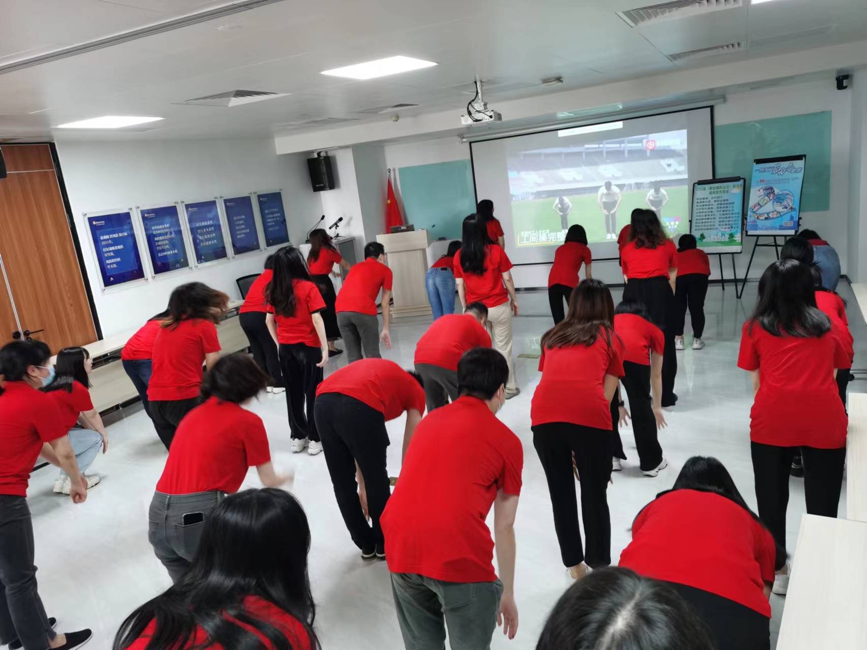 當(dāng)天下午,全體員工身著紅色文化衫,于公司多功能會(huì)議室集中學(xué)習(xí)《職業(yè)病防治法》相關(guān)內(nèi)容,其中包括職業(yè)病診斷與鑒定、患職業(yè)病職工依法享有的工傷保險(xiǎn)權(quán)益、女職工勞動(dòng)保護(hù)特別規(guī)定等等,以及科普了有關(guān)預(yù)防職業(yè)病的小知識(shí)、小妙招。隨后,質(zhì)量部同事組織大家跟隨音樂做起工間操,放松筋骨,愉悅身心。